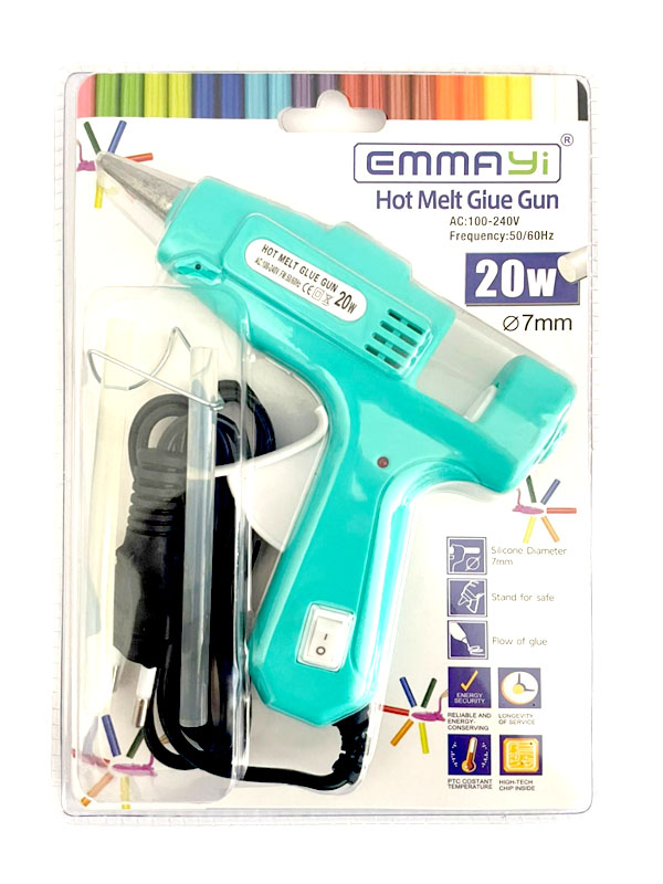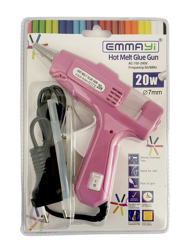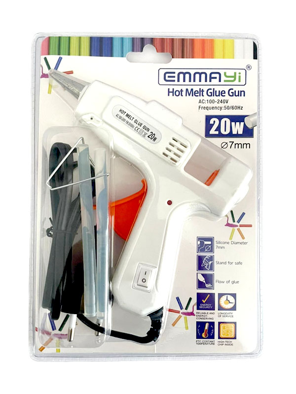Pistola de cola quente, importada, bico fino, botão liga/desliga.